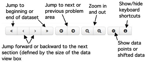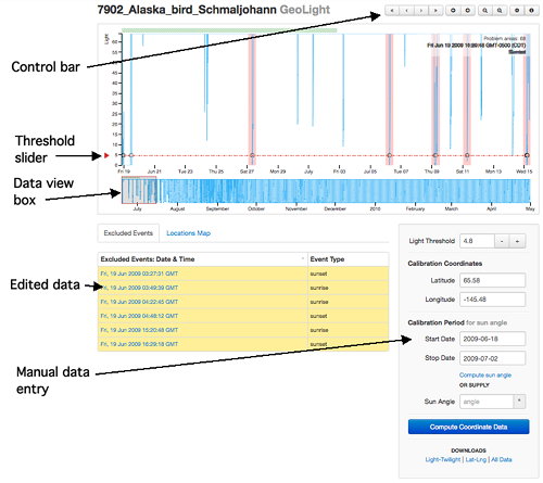 3.) You should see a graphical rendering of all of the data points that you have submitted with the problem areas highlighted. problem areas are parts of the data set where the light level is noisy and crosses the threshold sevaral times in quick succession. Use the mouse on the red arrow to adjust the threshold or type the desired threshold into the appropriate field in the manual data entry box. To navigate around the light profile graphic, use the mouse to manipulate the data view box. Drag the edges of the box to change its size (and the extent of the data shown above), and drag the middle of the box to change the position of the box (and the section of data shown).